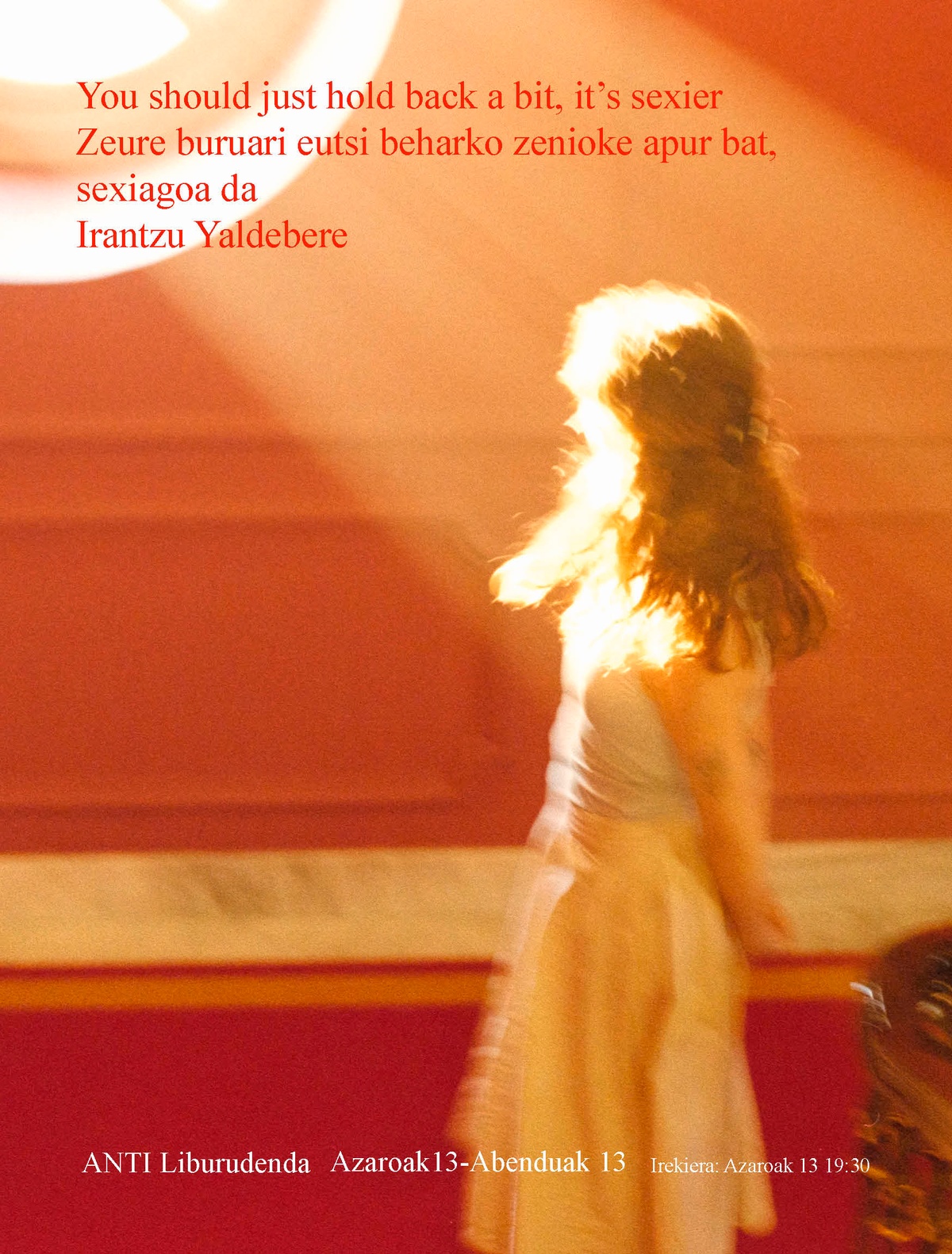 Burial eta Mark Fisherren arteko elkarrizketa batetik jaso dut erakusketaren izenburua. Zeure buruari eutsi beharko zenioke apur bat, sexiagoa da. Elkarrizketa bere osoan liburu dendan egongo da irakurgai ia 80 argazkirekin batera. Burialen hitzek gertutik harrapatu naute eta nire egin ditut. Ezin hobeto azalduta ageri baita biluztasuna bere zentzurik orokorrenean.